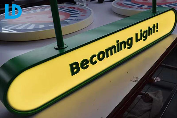 - Shop sign light box. Oval shape double sided light box signage, hanging install with metal tube, custom laser cut acrylic letter and stick it on the lightbox.