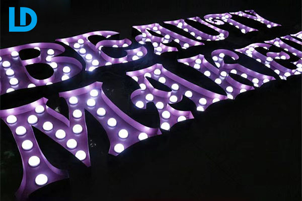 - Light up letters for wall. Stainless steel marquee signage, custom purple color and white led bulbs, perfect for outside advertising.