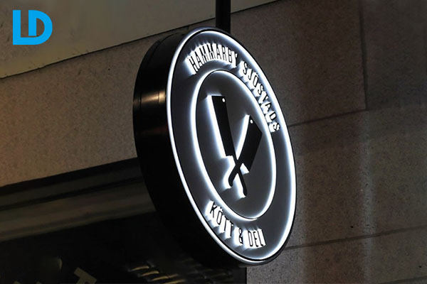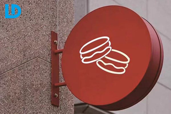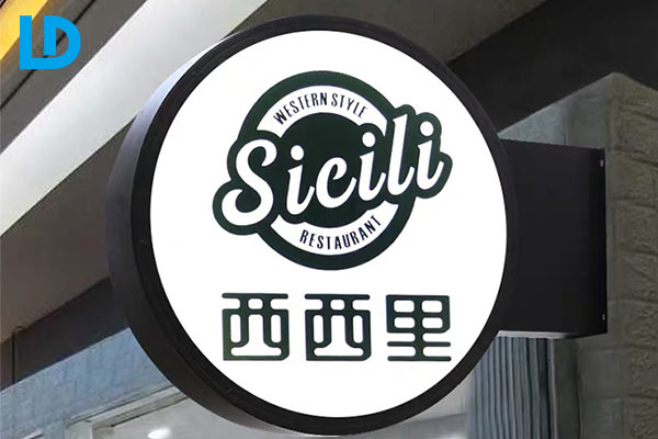 - Round lightbox sign. Double sided led projecting signage on wall, with stainless steel return and acrylic face panel.