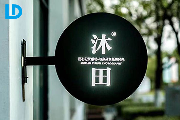 • Round blade sign. Exterior stainless steel metal light box signage with cut out backlit logo used indoor and outdoor.