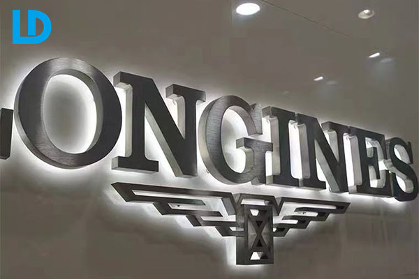 • Illuminated shop signs. Double sided stainless steel light box signage with laser cut logo, custom color and dimension.